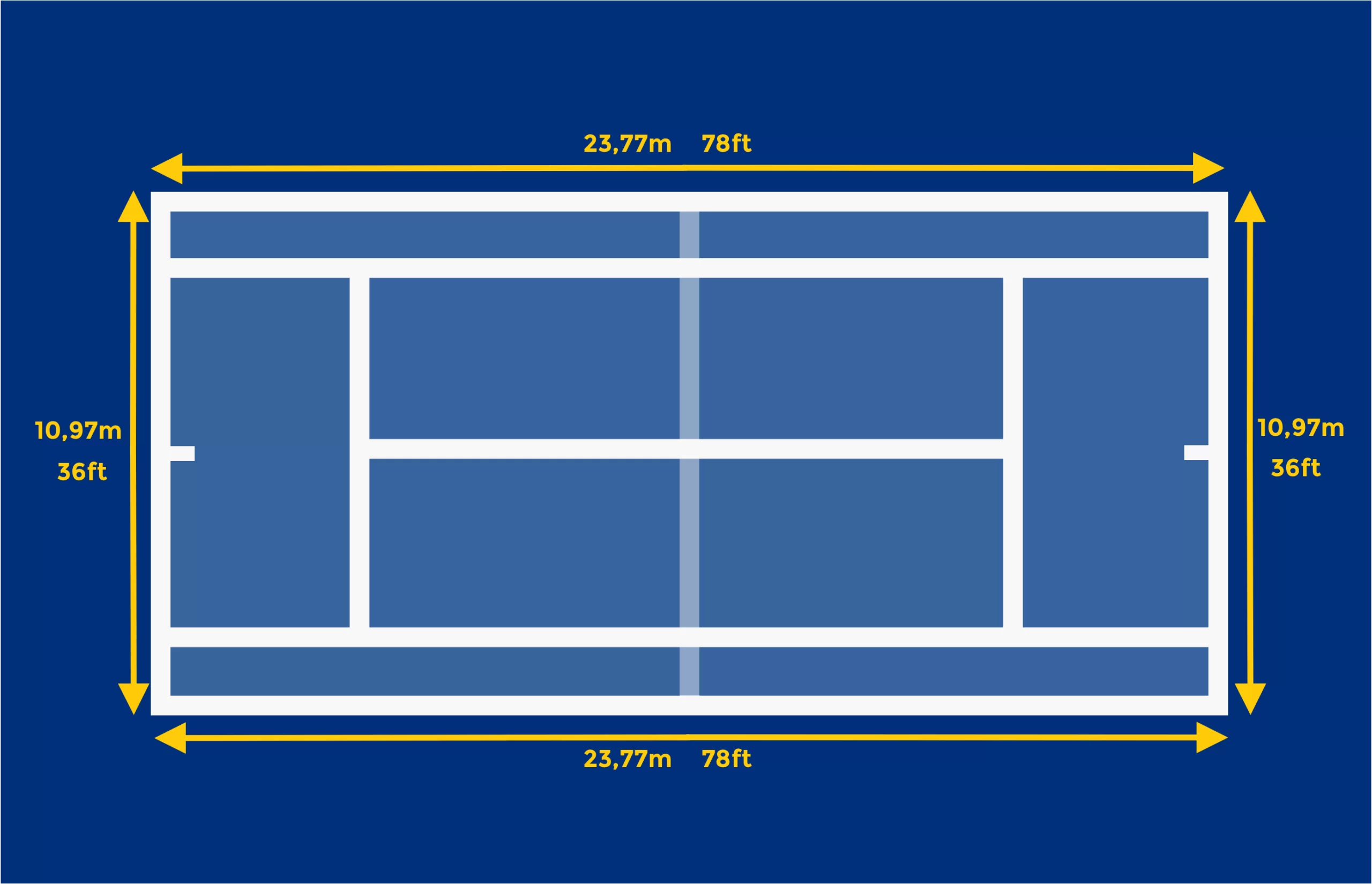 - Standardi tenniskenttä on 23,77 metriä (78 jalkaa) pitkä ja 10,97 metriä (36 jalkaa) leveä.