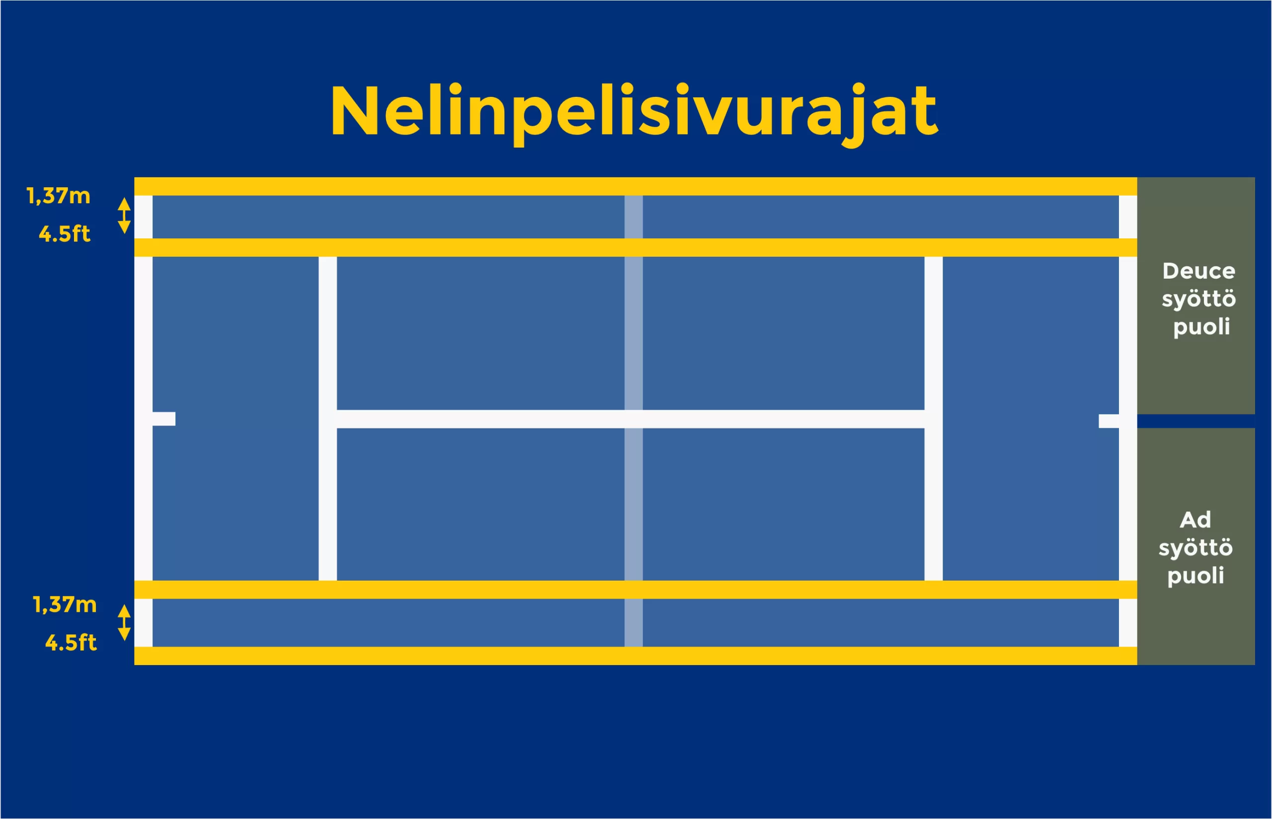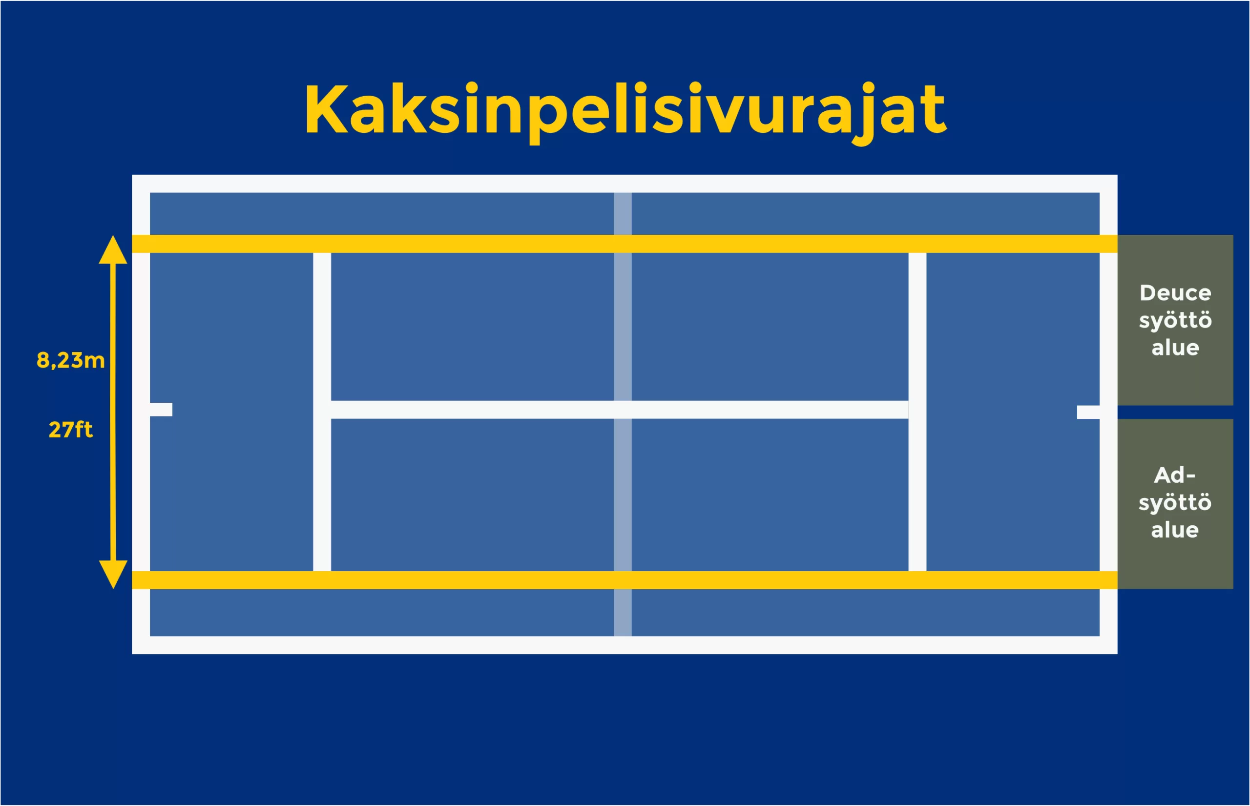 - Kaksinpelissä kenttä on 23,77 metriä (78 jalkaa) pitkä ja 8,23 metriä (27 jalkaa) leveä.