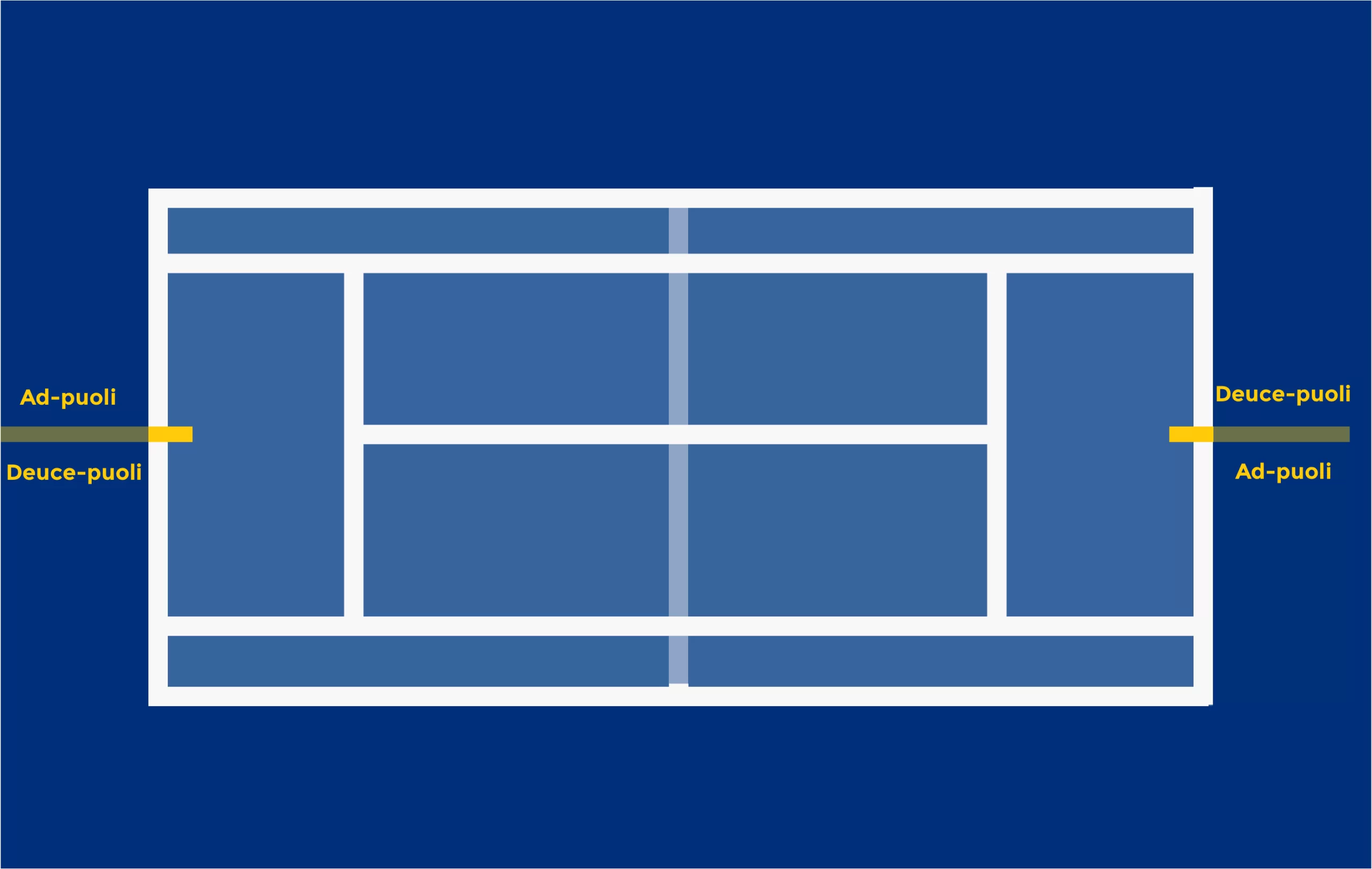 Keskiviiva jakaa kentän Deuce- ja ad-puoliin. Ottelussa pelaajan on syötettävä joka toinen syöttö deuce-puolelta.