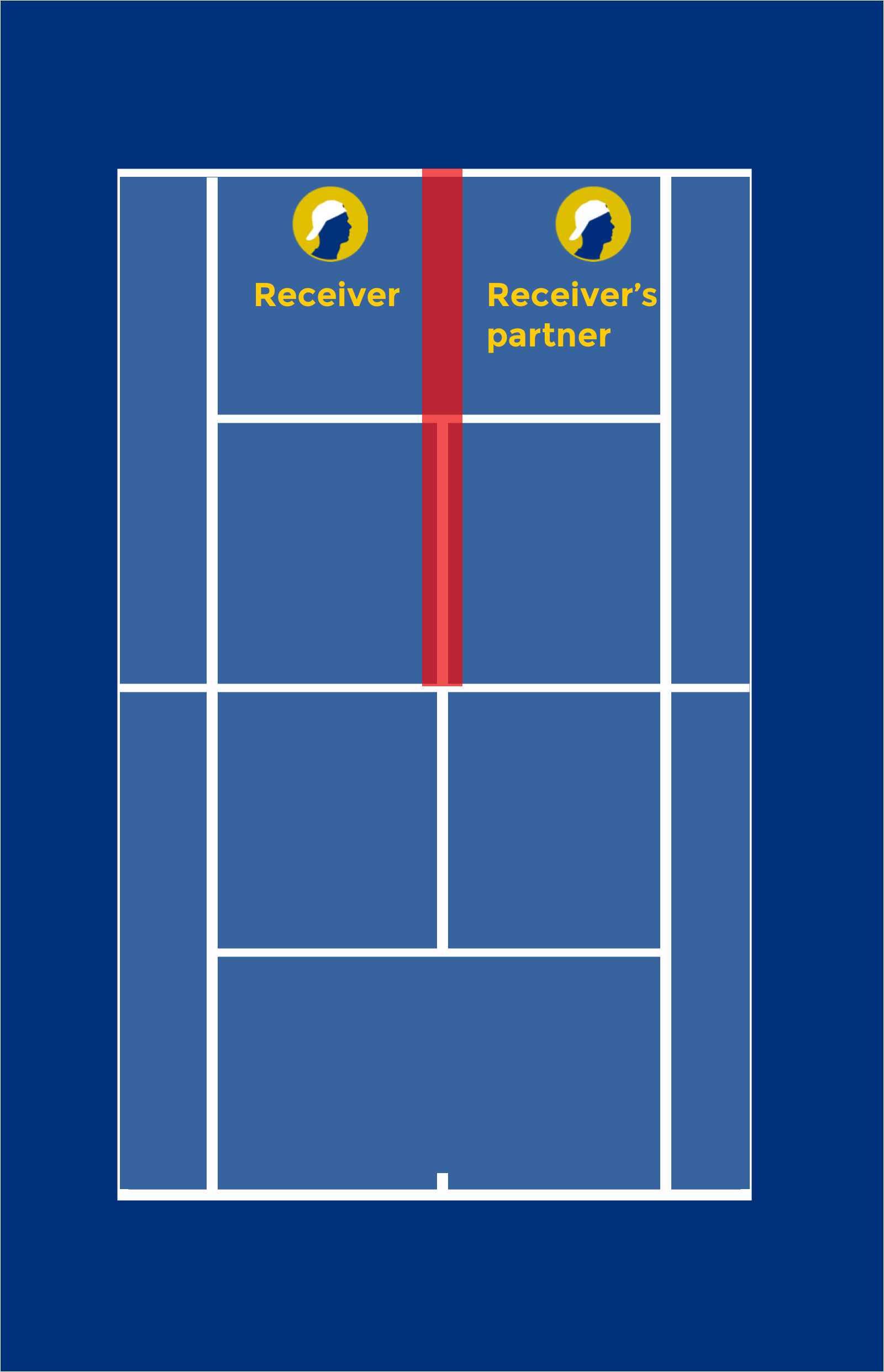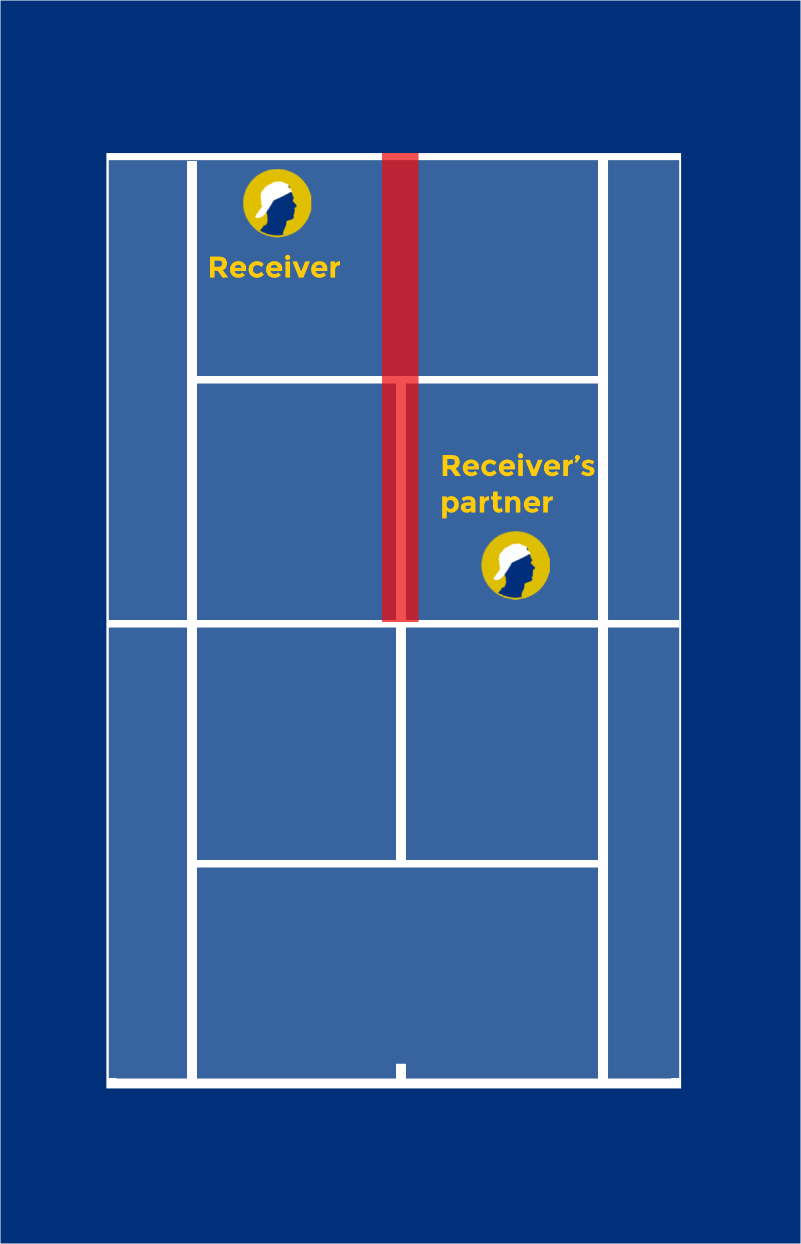 The positioning rules for the serving team are more lenient than the positioning rules for the receiving team. The serving player’s partner can stand anywhere on the court.